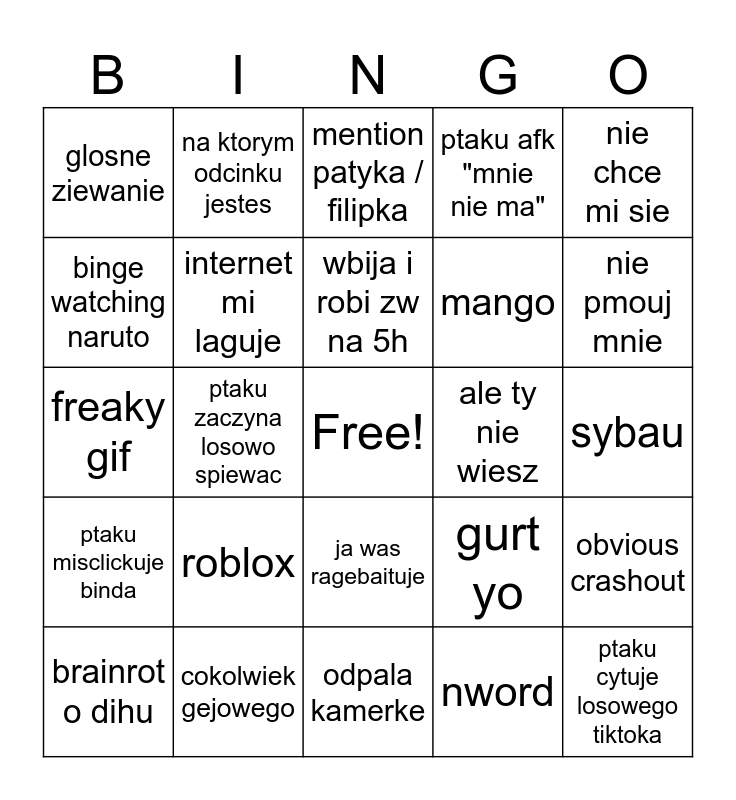 This bingo card has a free space and 24 words: roblox, cokolwiek gejowego, wbija i robi zw na 5h, brainrot o dihu, nie chce mi sie, glosne ziewanie, binge watching naruto, na ktorym odcinku jestes, ale ty nie wiesz, ja was ragebaituje, mango, freaky gif, gurt yo, obvious crashout, internet mi laguje, nword, sybau, mention patyka / filipka, nie pmouj mnie, ptaku zaczyna losowo spiewac, ptaku cytuje losowego tiktoka, ptaku misclickuje binda, ptaku afk "mnie nie ma" and odpala kamerke.