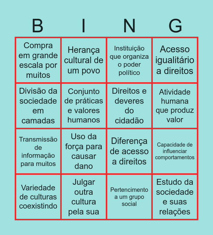 This bingo card has 16 words: Julgar outra cultura pela sua, Capacidade de influenciar comportamentos, Instituição que organiza o poder político, Compra em grande escala por muitos, Transmissão de informação para muitos, Herança cultural de um povo, Diferença de acesso a direitos, Pertencimento a um grupo social, Divisão da sociedade em camadas, Conjunto de práticas e valores humanos, Variedade de culturas coexistindo, Acesso igualitário a direitos, Uso da força para causar dano, Atividade humana que produz valor, Direitos e deveres do cidadão and Estudo da sociedade e suas relações.
