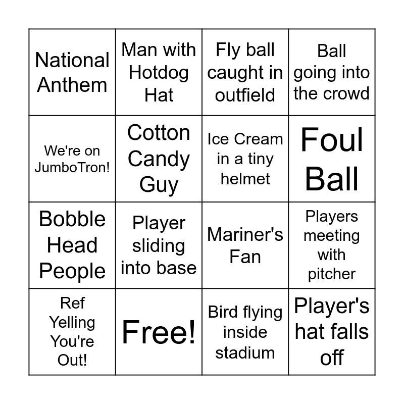 This bingo card has 24 words: Baxter, Home Run, Foul Ball, Strike Out, We're on JumboTron!, National Anthem, Cotton Candy Guy, Man with Hotdog Hat, Free!, Popcorn on ground, Bobble Head People, Mariner's Fan, Purple Dbacks Hat, Foam Finger, Ice Cream in a tiny helmet, Crowd doing the wave, Bird flying inside stadium, Fly ball caught in outfield, Player sliding into base, Players meeting with pitcher, Ref Yelling You're Out!, Player's hat falls off, Ball going into the crowd and Broken bat.