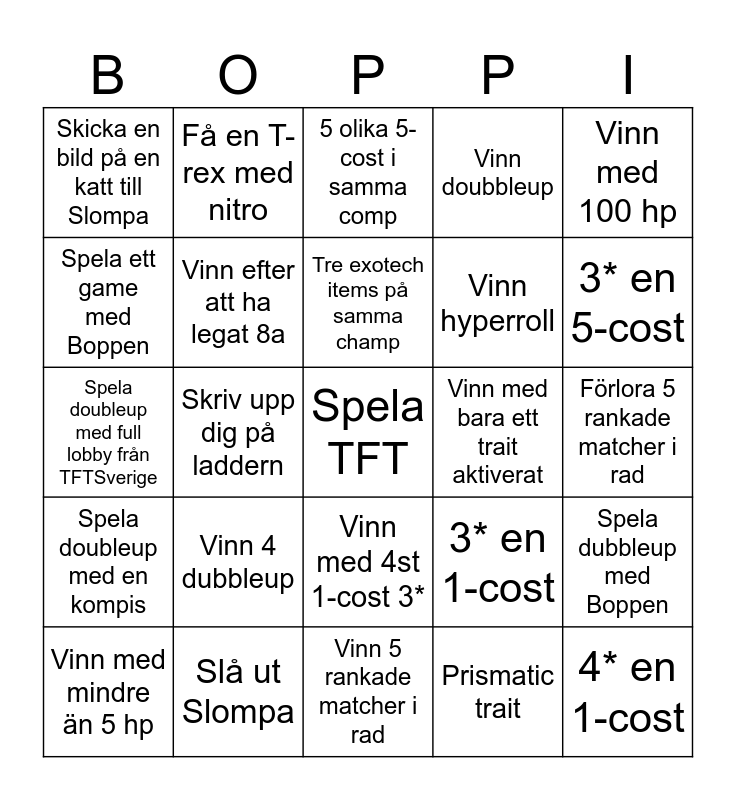 This bingo card has a free space and 34 words: Slå ut en TFTSverige mod, Prismatic trait, 3* en 4-cost, Vinn med hero augment, Spela doubleup med en kompis, Vinn efter att ha legat 8a, Vinn med 100 hp, Vinn med mindre än 5 hp, Få en T-rex med nitro, Spela full lobby från TFTSverige, Tre exotech items på samma champ, 5 olika 5-cost i samma comp, Spela 20 games TFT, Aktivera 8 olika traits på samma gång, Vinn med bara ett trait aktiverat, 3* en 5-cost, Slå ut Slompa, Spela doubleup med full lobby från TFTSverige, Vinn 4 dubbleup, 3* en 1-cost, Vinn med 4st 1-cost 3*, 3* 4-cost i dubbleup, Skicka en bild på en katt till Slompa, Förlora 5 rankade matcher i rad, Vinn 5 rankade matcher i rad, 4* en 1-cost, Vinn doubbleup, Vinn det tillfälliga gamemodet, Vinn hyperroll, Spela ett game med Boppen, Led laddern i minst 15 minuter, Skriv upp dig på laddern, Spela dubbleup med Boppen and Spela 10 games rankat.