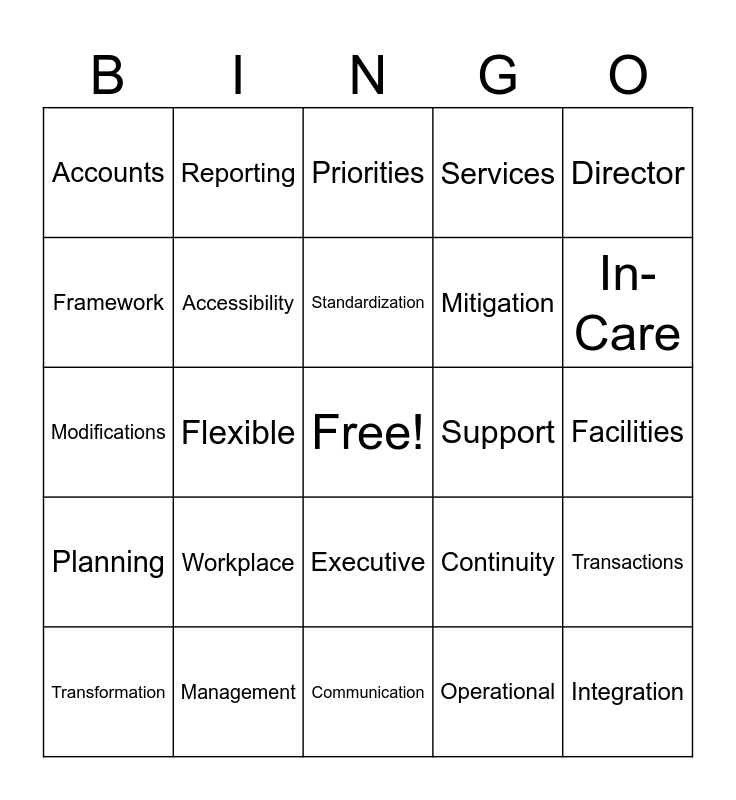 This bingo card has a free space and 45 words: Vision, Integration, Mandate, Transformation, Leadership, Operational, Priorities, Collaboration, Director, Management, Services, Support, Executive, Workplace, JIRA, Communication, Project, Modifications, Renewals, In-Care, Reporting, Recoveries, Financial, Accounts, Payable, Facilities, Assets, Emergency, Continuity, Planning, Contracts, Transactions, Modernization, Administrative, Dashboard, Flexible, Building, Lease, Technology, Standardization, Framework, Mitigation, Recovery, Accessibility and Information.