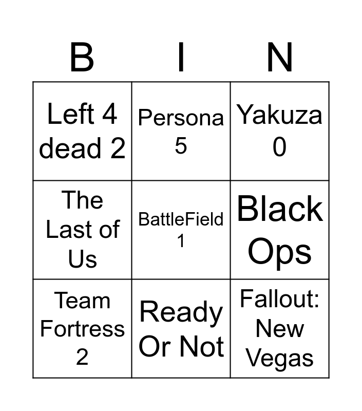 This bingo card has 24 words: Dead Space 2, BattleFront 2, Ready Or Not, CyberPunk 2077, BattleField 1, Left 4 dead 2, Black Ops, Persona 5, Shadow the Hedgehog, Batman: Arkham Asylum, Fallout: New Vegas, Uncharted 2, Disco Elysium, Portal 2, Team Fortress 2, AC: Brotherhood, Hotline Miami 2, Yakuza 0, League of Legends, Expedition 33, Tears of the Kingdom, Tekken 8, The Last of Us and Darktide.