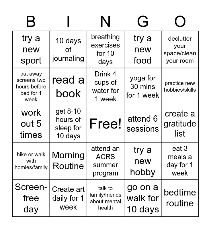 This bingo card has a free space and 24 words: Morning Routine, Create art daily for 1 week, Drink 4 cups of water for 1 week, Screen-free day, declutter your space/clean your room, try a new sport, put away screens two hours before bed for 1 week, 10 days of journaling, attend 6 sessions, attend an ACRS summer program, yoga for 30 mins for 1 week, work out 5 times, try a new hobby, eat 3 meals a day for 1 week, read a book, go on a walk for 10 days, create a gratitude list, breathing exercises for 10 days, practice new hobbies/skills, get 8-10 hours of sleep for 10 days, bedtime routine, hike or walk with homies/family, try a new food and talk to family/friends about mental health.
