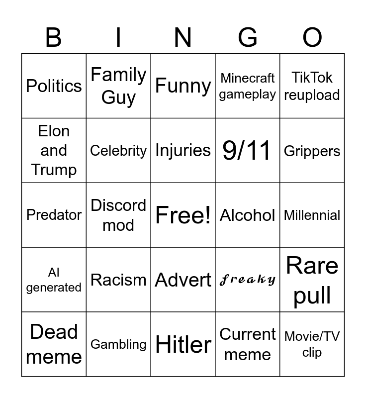 This bingo card has a free space and 24 words: Racism, Gambling, Injuries, Dead meme, TikTok reupload, Politics, Elon and Trump, Family Guy, Alcohol, Advert, 9/11, Predator, 𝓯𝓻𝓮𝓪𝓴𝔂, Rare pull, Celebrity, Current meme, Millennial, Funny, Grippers, Discord mod, Movie/TV clip, AI generated, Minecraft gameplay and Hitler.