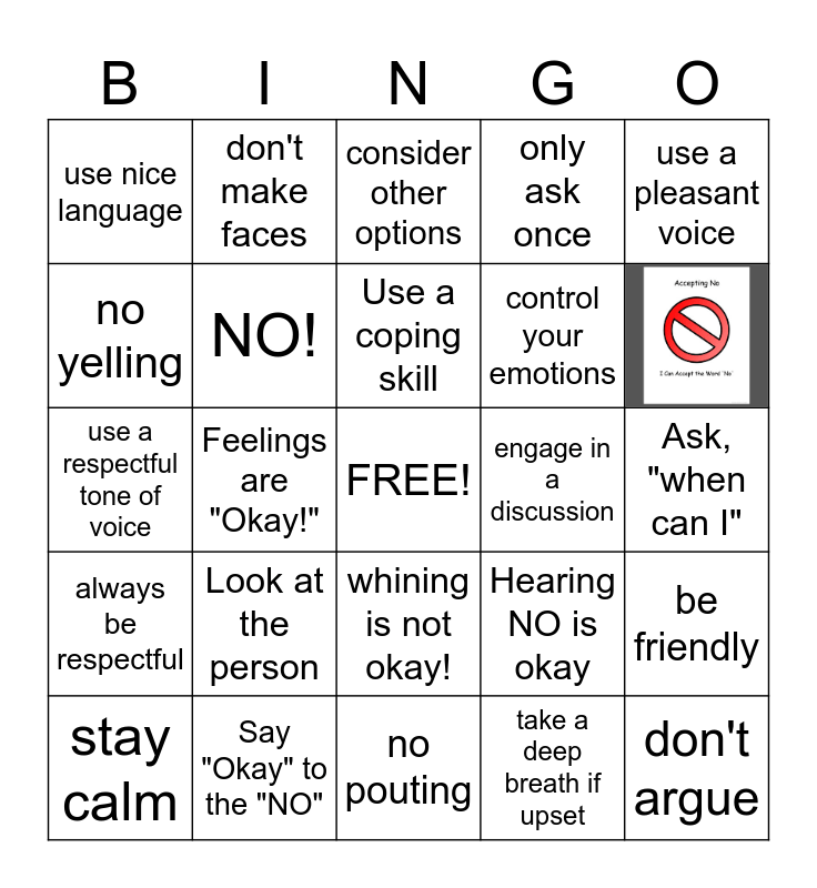 This bingo card has 1 images, a free space and 23 words: Look at the person, Say "Okay" to the "NO", Use a coping skill, stay calm, use a pleasant voice, use nice language, no yelling, don't make faces, engage in a discussion, whining is not okay!, control your emotions, use a respectful tone of voice, Hearing NO is okay, be friendly, NO!, take a deep breath if upset, Ask, "when can I", consider other options, Feelings are "Okay!", don't argue, always be respectful, only ask once and no pouting.