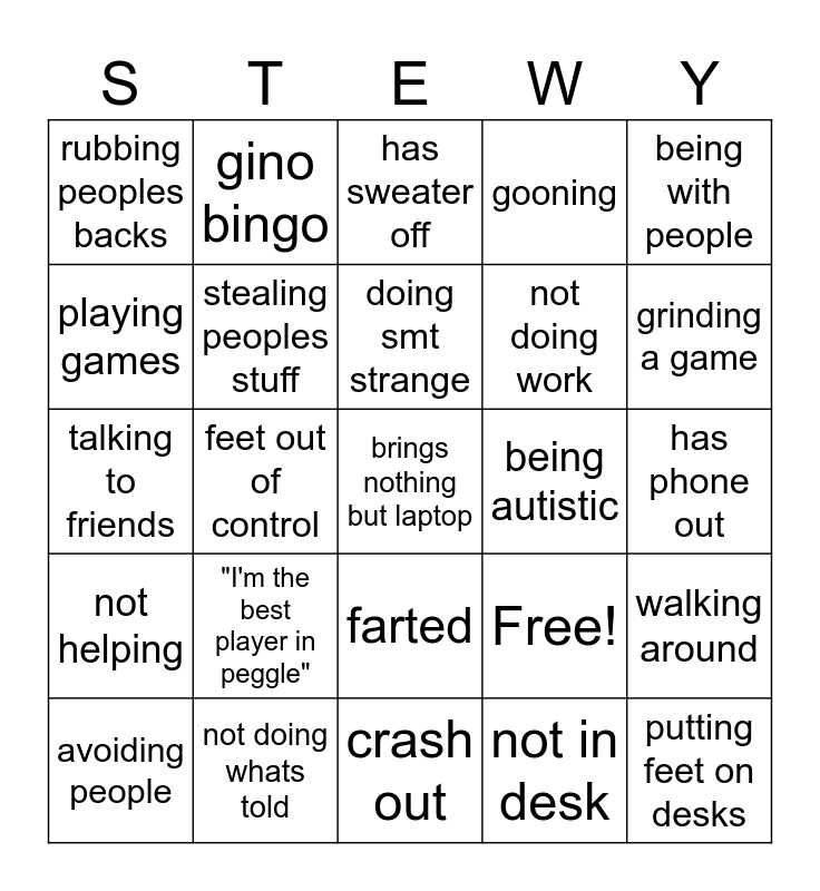 This bingo card has 25 words: "I'm the best player in peggle", crash out, doing smt strange, avoiding people, being with people, rubbing peoples backs, playing games, gino bingo, being autistic, farted, not doing work, talking to friends, Free!, walking around, stealing peoples stuff, putting feet on desks, has phone out, has sweater off, grinding a game, feet out of control, brings nothing but laptop, not doing whats told, not helping, gooning and not in desk.