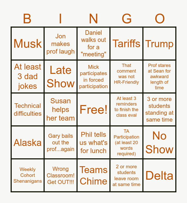 This bingo card has a free space and 24 words: Gary bails out the prof...again, Wrong Classroom! Get OUT!!!, Mick participates in forced participation, Weekly Cohort Shenanigans, Trump, Musk, At least 3 dad jokes, Jon makes prof laugh, At least 3 reminders to finish the class eval, Phil tells us what's for lunch, That comment was not HR-Friendly, Technical difficulties, TA Participation (at least 20 words required), No Show, Late Show, 2 or more students leave room at same time, 3 or more students standing at same time, Daniel walks out for a "meeting", Prof stares at Sean for awkward length of time, Susan helps her team, Delta, Alaska, Tariffs and Teams Chime.