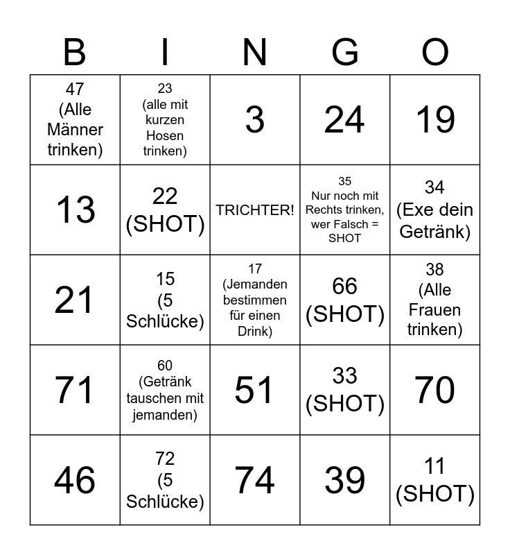 This bingo card has 76 words: 1 (Alle Schweizer trinken), 2 SCHLÜCKE, 3, 4, 5 LIEGEN, 6, 7 Nur noch mit Rechts trinken, wer Falsch = SHOT, 8 Sekunden Trinken, 9, 10, 11 (SHOT), 12, TRICHTER!, 13, 14, 15 (5 Schlücke), 16, 17 (Jemanden bestimmen für einen Drink), 18, 19, 20, 21, 22 (SHOT), 23 (alle mit kurzen Hosen trinken), 24, 25 (alle mit cap trinken), 26, 27, 28, 29 (Wer zuletzt klatscht, trinkt 3 Schlücke), 30, 31, 32, 33 (SHOT), 34 (Exe dein Getränk), 35 Nur noch mit Rechts trinken, wer Falsch = SHOT, 36, 37, 38 (Alle Frauen trinken), 39, 40, 41 (5 Schlücke), 42, 43, 44 (SHOT), 45, 46, 47 (Alle Männer trinken), 48, 49, 50 (Wasserfall, beginnend mit jüngstem), 51, 52, 53, 54 (5 Schlücke), 55 (SHOT), 56, 57, 58 (Wasserfall beginnend mit der grössten Person), 59, 60 (Getränk tauschen mit jemanden), 61, 62 (Alle die sitzen, trinken), 63, 64, 65, 66 (SHOT), 67, 68, 69 (TRICHTER TIME! Für alle mit dieser Nummer), 70, 71, 72 (5 Schlücke), 73, 74 and 75 (5 Schlücke).