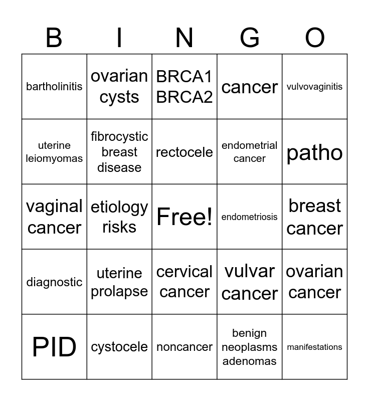 This bingo card has a free space and 24 words: uterine prolapse, cystocele, rectocele, PID, vulvovaginitis, bartholinitis, uterine leiomyomas, ovarian cysts, endometriosis, cervical cancer, endometrial cancer, vaginal cancer, vulvar cancer, ovarian cancer, fibrocystic breast disease, benign neoplasms adenomas, breast cancer, BRCA1 BRCA2, patho, etiology risks, manifestations, diagnostic, cancer and noncancer.