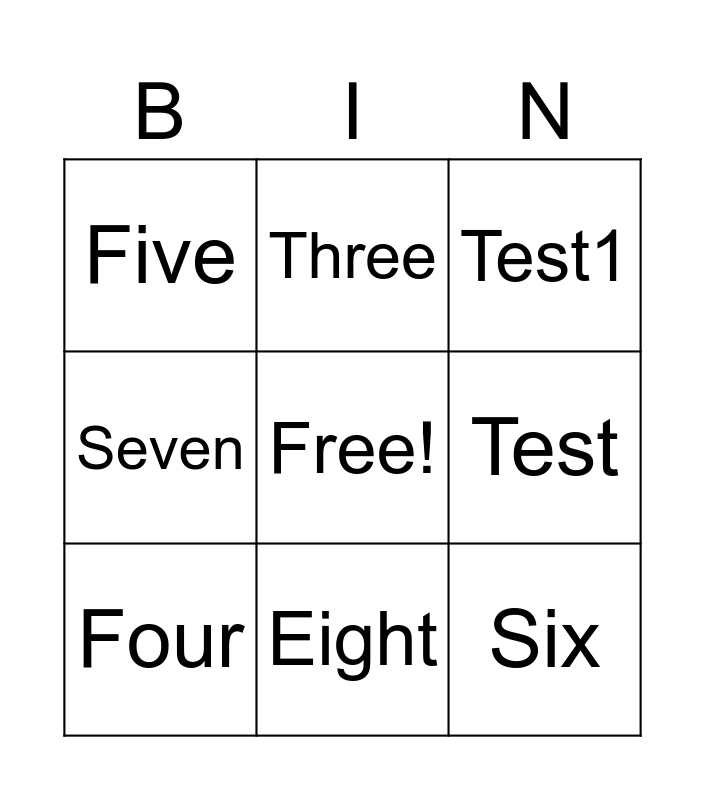 This bingo card has a free space and 8 words: Test, Test1, Three, Four, Five, Six, Seven and Eight.