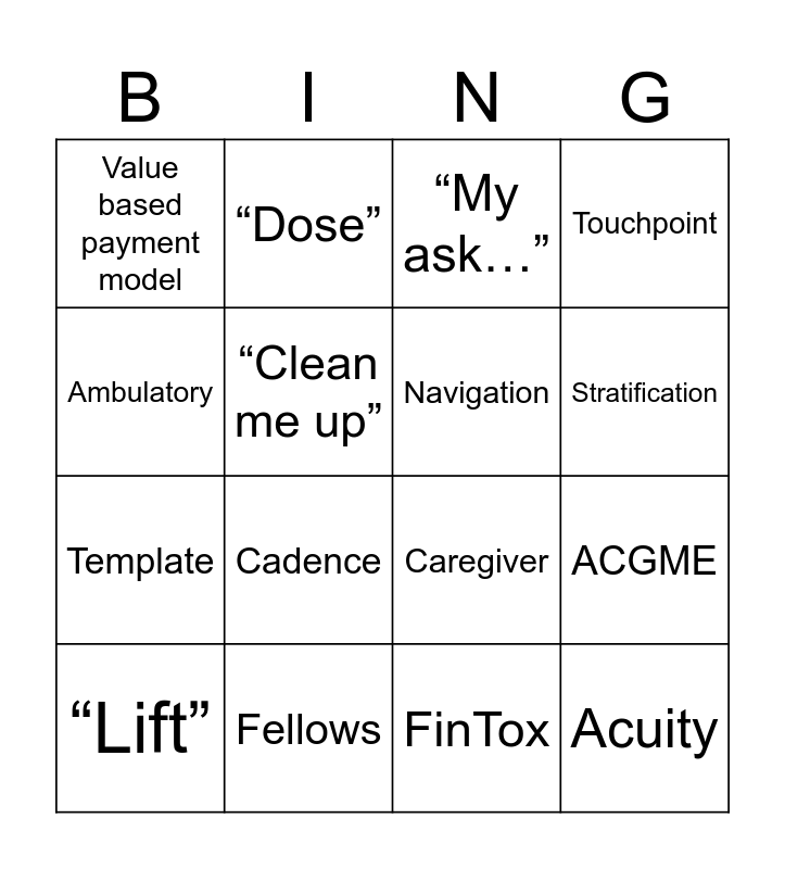 This bingo card has 16 words: Fellows, ACGME, “My ask…”, Value based payment model, Template, “Dose”, Caregiver, FinTox, Ambulatory, “Clean me up”, “Lift”, Touchpoint, Cadence, Stratification, Navigation and Acuity.