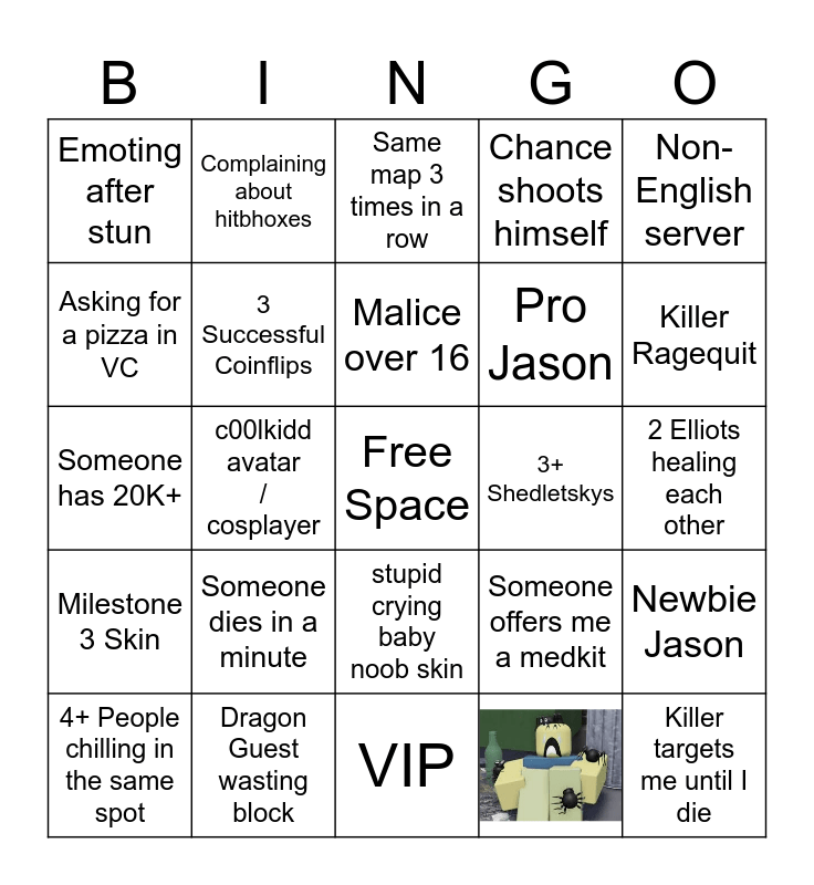 This bingo card has 1 images, a free space and 24 words: Someone dies in a minute, VIP, Malice over 16, 4+ People chilling in the same spot, Non-English server, Emoting after stun, Asking for a pizza in VC, Complaining about hitbhoxes, 3+ Shedletskys, stupid crying baby noob skin, Pro Jason, Someone has 20K+, Someone offers me a medkit, Newbie Jason, 3 Successful Coinflips, People syncing emotes, 2 Elliots healing each other, Same map 3 times in a row, Killer Ragequit, c00lkidd avatar / cosplayer, Killer targets me until I die, Dragon Guest wasting block, Milestone 3 Skin and Chance shoots himself.