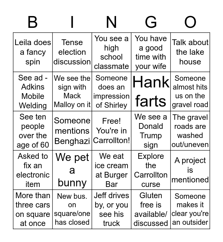 This bingo card has a free space and 24 words: We pet a bunny, New bus. on square/one has closed, Someone does an impression of Shirley, More than three cars on square at once, Talk about the lake house, Leila does a fancy spin, See ad - Adkins Mobile Welding, Tense election discussion, We see a Donald Trump sign, We eat ice cream at Burger Bar, Hank farts, See ten people over the age of 60, Explore the Carrollton curse, A project is mentioned, We see the sign with Mack Malloy on it, Gluten free is available/ discussed, The gravel roads are washed out/uneven, You see a high school classmate, Someone almost hits us on the gravel road, Someone mentions Benghazi, Someone makes it clear you're an outsider, Asked to fix an electronic item, You have a good time with your wife and Jeff drives by, or you see his truck.