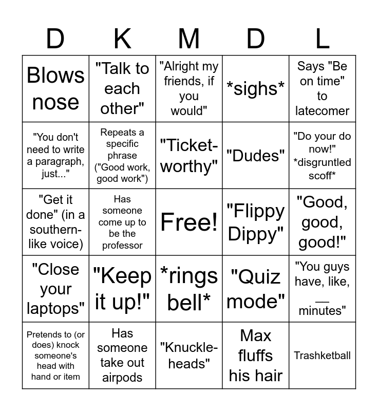 This bingo card has a free space and 27 words: "Quiz mode", "Folks", "Dudes", "Knuckle-heads", "You don't need to write a paragraph, just...", "Alright my friends, if you would", "Talk to each other", "Close your laptops", "Flippy Dippy", "You guys have, like, __ minutes", "Get it done" (in a southern-like voice), *sighs*, Pretends to (or does) knock someone's head with hand or item, Has someone take out airpods, "Do your do now!" *disgruntled scoff*, Says "dude" specifically after someones name, Repeats a specific phrase ("Good work, good work"), "Ticket-worthy", "Keep it up!", Blows nose, "Good, good, good!", Max fluffs his hair, Has someone come up to be the professor, Trashketball, *rings bell*, Says "Be on time" to latecomer and "__ minutos".