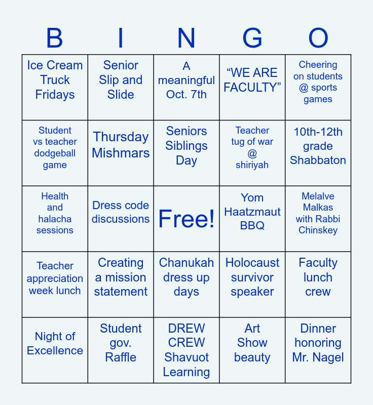 This bingo card has a free space and 29 words: Night of Excellence, Freshman shabbaton, Dress code discussions, Broadway with history dept., Ice Cream Truck Fridays, A meaningful Oct. 7th, Thursday Mishmars, Creating a mission statement, Yom Haatzmaut BBQ, Student gov. Raffle, Melalve Malkas with Rabbi Chinskey, Dinner honoring Mr. Nagel, DREW CREW Shavuot Learning, Art Show beauty, 10th-12th grade Shabbaton, Fishing trip, Chanukah dress up days, Teacher appreciation week lunch, Cheering on students @ sports games, Health and halacha sessions, Holocaust survivor speaker, Faculty meetings, Teacher tug of war @ shiriyah, Student vs teacher dodgeball game, “WE ARE FACULTY”, Senior Slip and Slide, Faculty lunch crew, Seniors Siblings Day and Students shining @ book trials.