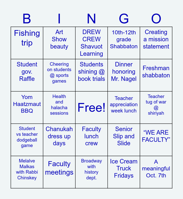 This bingo card has a free space and 29 words: Melalve Malkas with Rabbi Chinskey, Dress code discussions, Health and halacha sessions, Night of Excellence, Fishing trip, DREW CREW Shavuot Learning, Cheering on students @ sports games, Chanukah dress up days, Teacher appreciation week lunch, Faculty meetings, Teacher tug of war @ shiriyah, A meaningful Oct. 7th, Broadway with history dept., Ice Cream Truck Fridays, Freshman shabbaton, Seniors Siblings Day, Faculty lunch crew, Student vs teacher dodgeball game, Creating a mission statement, Yom Haatzmaut BBQ, Senior Slip and Slide, Holocaust survivor speaker, Dinner honoring Mr. Nagel, Student gov. Raffle, 10th-12th grade Shabbaton, Art Show beauty, “WE ARE FACULTY”, Students shining @ book trials and Thursday Mishmars.