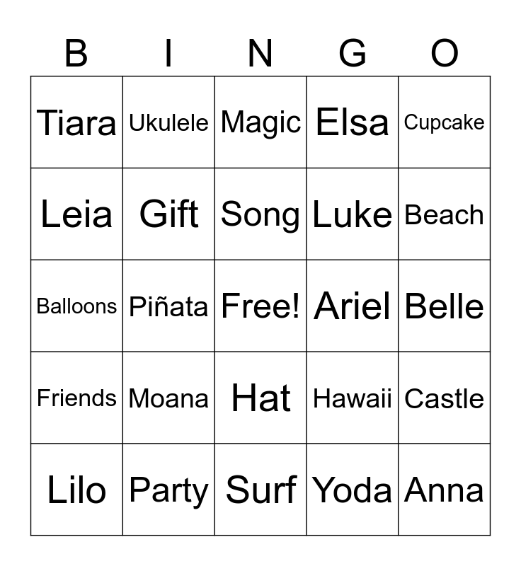 This bingo card has a free space and 40 words: Cake, Balloons, Candles, Gift, Party, Hat, Song, Ice cream, Cupcake, Friends, Piñata, Elsa, Anna, Belle, Ariel, Moana, Rapunzel, Tiara, Dress, Magic, Castle, Yoda, Luke, Leia, Vader, Lightsaber, Jedi, Droid, Star, Ship, Chewbacca, Lilo, Stitch, Hawaii, Beach, Surf, Ohana, Hula, Ukulele and Island.