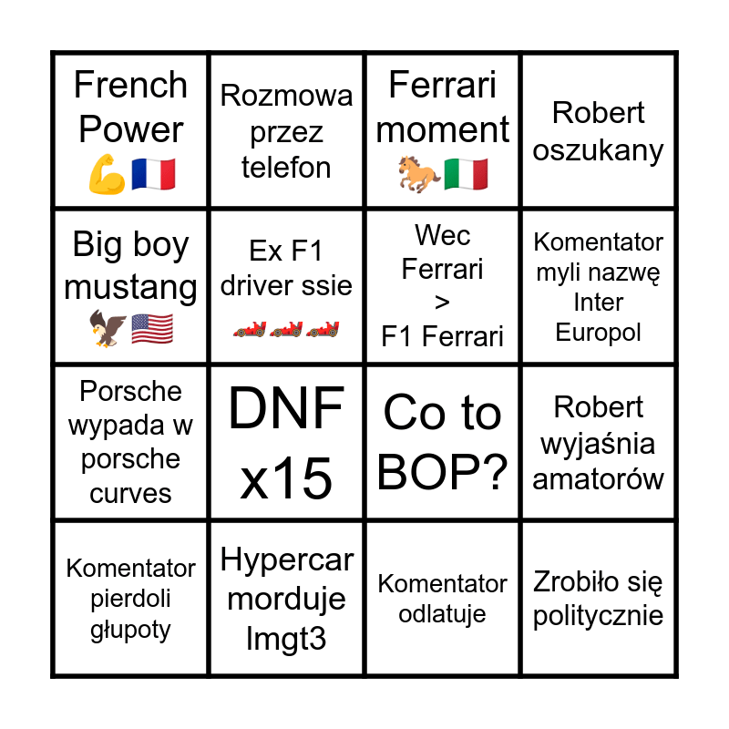 This bingo card has 16 words: Hypercar morduje lmgt3, Robert wyjaśnia amatorów, Ferrari moment 🐎🇮🇹, French Power💪🇫🇷, Porsche wypada w porsche curves, Rozmowa przez telefon, Co to BOP?, Komentator odlatuje, Big boy mustang🦅🇺🇸, Ex F1 driver ssie 🏎🏎🏎, Komentator pierdoli głupoty, Robert oszukany, DNF x15, Komentator myli nazwę Inter Europol, Wec Ferrari > F1 Ferrari and Zrobiło się politycznie.