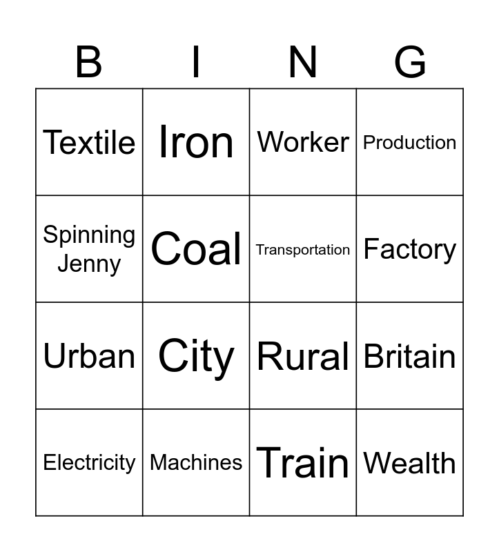 This bingo card has 25 words: Free!, Industrial Revolution, Factory, Steam Engine, Spinning Jenny, Textile, Coal, Iron, Machines, Invention, Urban, Rural, Child Labor, Pollution, Transportation, Canal, Train, Worker, City, Britain, Electricity, Engineer, Wealth, Production and Change.