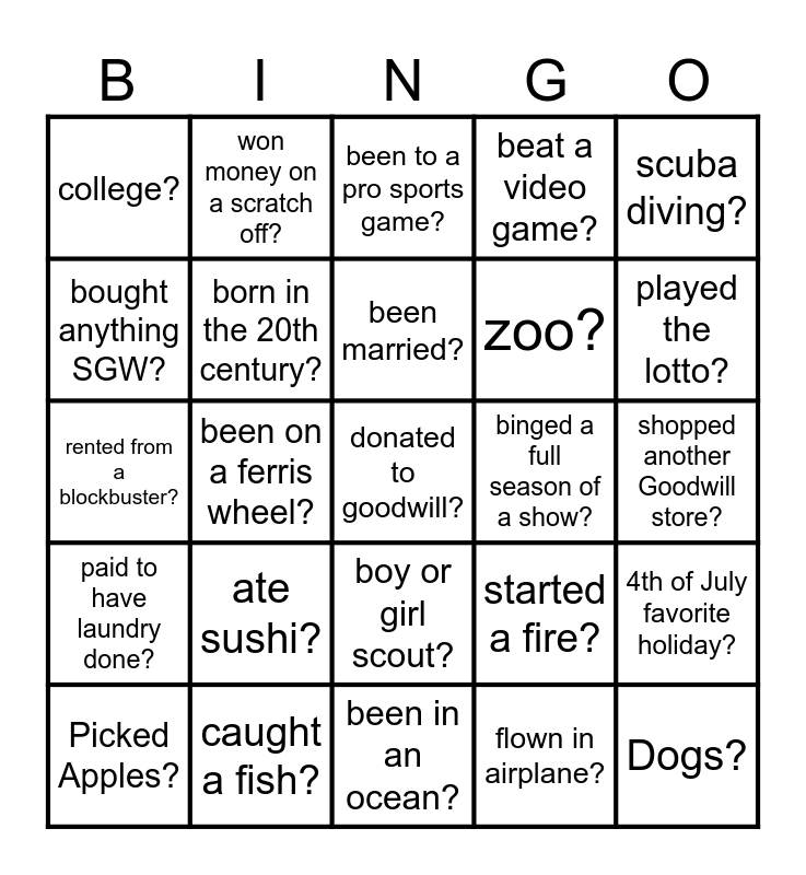 This bingo card has a free space and 44 words: Traveled out of the country?, Dogs?, Cats?, Picked Apples?, Skydiving? or Bungee jump, flown in airplane?, been to a pro sports game?, taught someone to ride a bike?, scuba diving?, caught a fish?, beat a video game?, binged a full season of a show?, boy or girl scout?, ate sushi?, been to a concert?, been in an ocean?, rock climbed?, rented from a blockbuster?, lucky number 7?, played the lotto?, won money on a scratch off?, tattoos?, golfed?, college?, dyed your hair?, shopped another Goodwill store?, been to a wine tasting?, jumped off a diving board, started a fire?, paid to have laundry done?, tye-dyed something?, 4th of July favorite holiday?, dressed as a movie character for Halloween?, kids?, been on a ferris wheel?, donated blood?, quit without notice?, worked more than job at once?, been married?, bought anything SGW?, zoo?, suspended from school?, born in the 20th century? and played hungry hippos?.