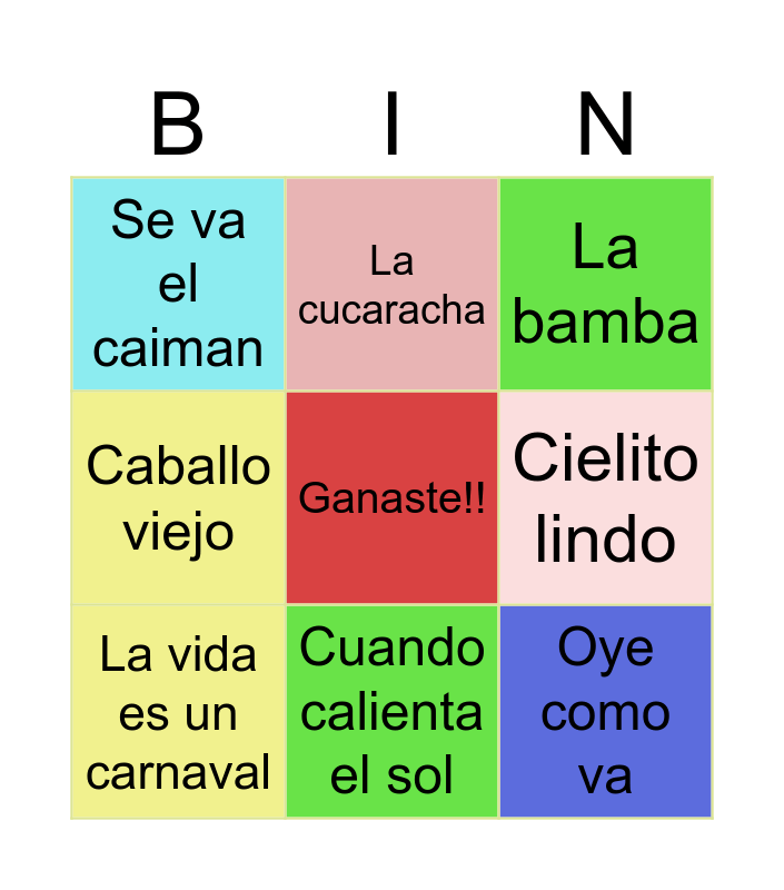 This bingo card has a free space and 8 words: Cielito lindo, La bamba, La cucaracha, La vida es un carnaval, Se va el caiman, Oye como va, Caballo viejo and Cuando calienta el sol.