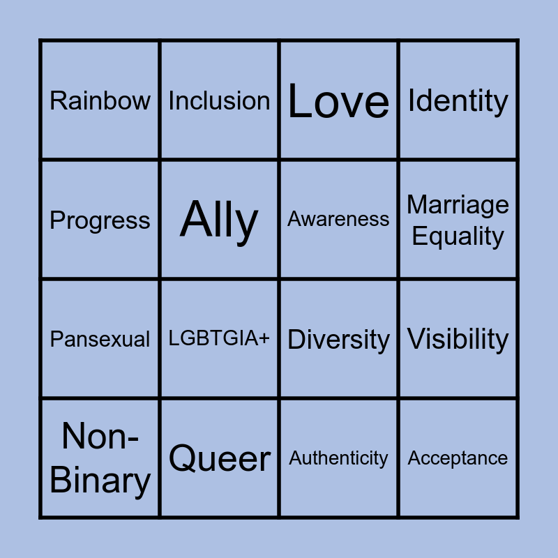 This bingo card has 28 words: Transgender, Lesbian, Pansexual, Bisexual, Ally, Love, Inclusion, Acceptance, Queer, Courage, Diversity, Identity, Pride Flag, June 28, 1969, LGBTGIA+, Support, Pride Parade, Awareness, Marriage Equality, Pronouns, Rainbow, Empower, Non-Binary, Visibility, Authenticity, Liberation, Progress and Gay.
