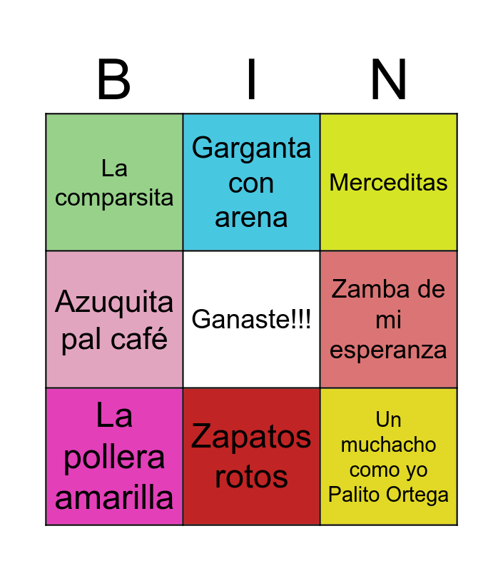 This bingo card has a free space and 8 words: Zamba de mi esperanza, Merceditas, Garganta con arena, La pollera amarilla, La comparsita, Un muchacho como yo Palito Ortega, Azuquita pal café and Zapatos rotos.