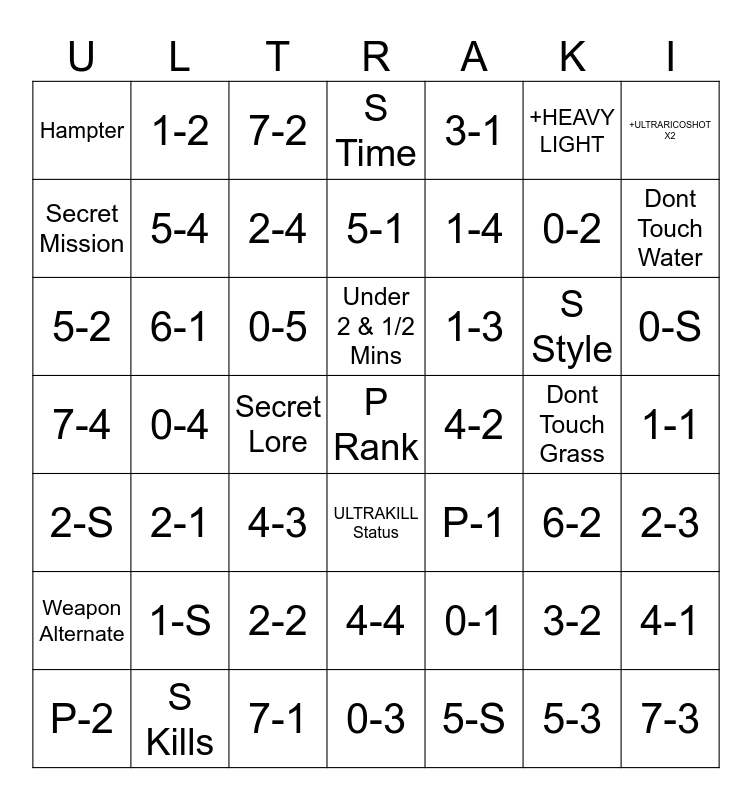 This bingo card has a free space and 48 words: 0-1, 0-2, 0-3, 0-4, 0-5, 1-1, 1-2, S Kills, +HEAVY LIGHT, ULTRAKILL Status, +ULTRARICOSHOT X2, S Time, S Style, 1-3, Weapon Alternate, Dont Touch Grass, Secret Mission, Dont Touch Water, 3-2, 3-1, 1-4, Secret Lore, Hampter, 5-4, 4-1, 2-4, 0-S, P-2, Under 2 & 1/2 Mins, 6-1, 5-3, 4-2, 2-3, 1-S, 7-4, P-1, 6-2, 5-2, 4-3, 2-2, 2-S, 7-3, 7-2, 7-1, 5-1, 4-4, 2-1 and 5-S.