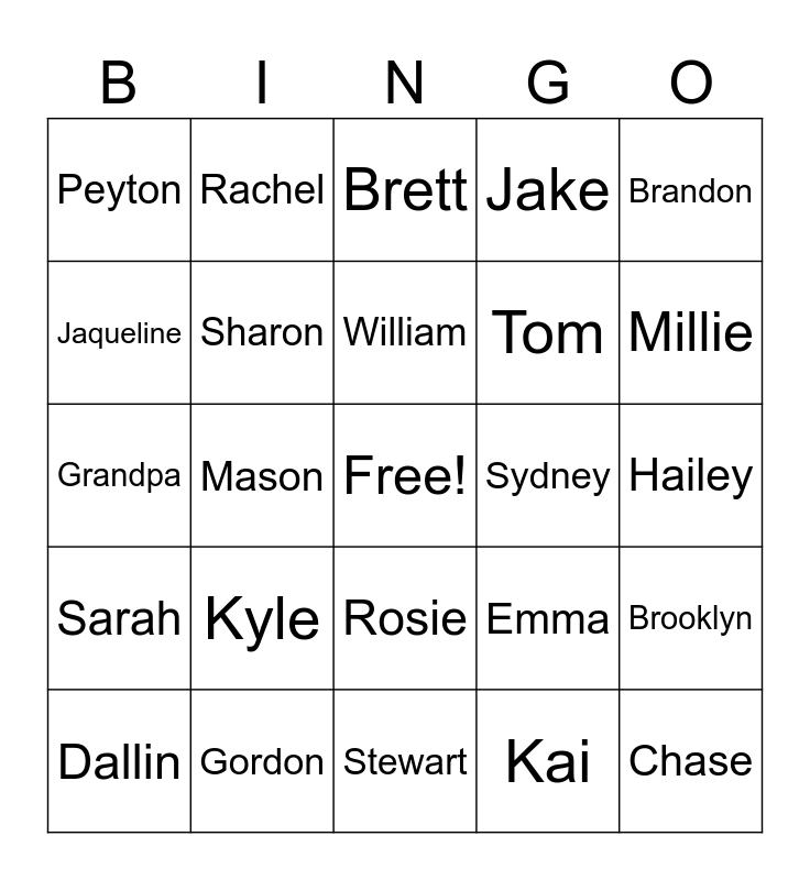 This bingo card has a free space and 40 words: Grandma, Grandpa, Gary, Sharon, Gordon, Rosie, William, Wesley, Brandon, Sarah, Mason, Jake, Chase, Hailey, Sydney, Kyle, Shanie, Peyton, Kaitlyn, Brett, Brooklyn, Kai, Tom, Jaqueline, Henry, Caroline, Juliet, Blake, McKenzie, Maren, Lily, Dallin, Doug, Emma, Millie, Stewart, Emily, Abigail, Rachel and Briton.