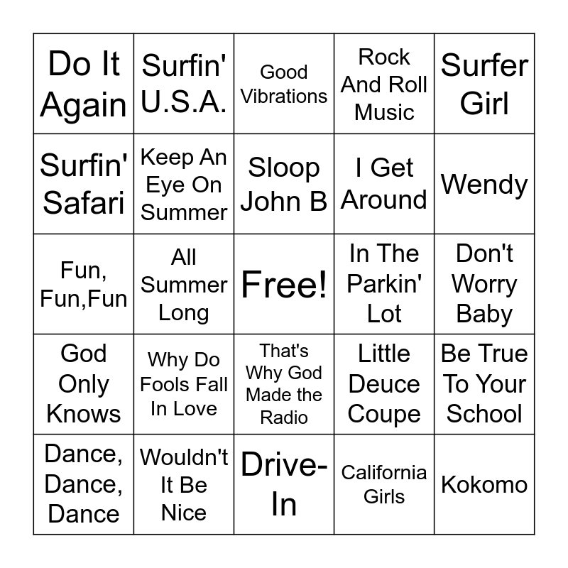 This bingo card has a free space and 26 words: That's Why God Made the Radio, California Girls, Sloop John B, Wouldn't It Be Nice, Surfer Girl, Do It Again, Surfin' Safari, Surfin' U.S.A., Don't Worry Baby, Little Deuce Coupe, I Get Around, Fun, Fun,Fun, Be True To Your School, Dance, Dance, Dance, All Summer Long, Help Me, Rhonda, Rock And Roll Music, God Only Knows, Good Vibrations, Kokomo, Wendy, Drive-In, In The Parkin' Lot, Why Do Fools Fall In Love, Keep An Eye On Summer and Let's Go Away For Awhile.