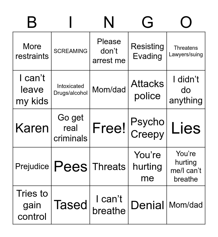 This bingo card has a free space and 24 words: Pees, Tased, Mom/dad, Tries to gain control, Threatens Lawyers/suing, More restraints, I can’t leave my kids, SCREAMING, Psycho Creepy, Threats, Attacks police, Karen, You’re hurting me, You’re hurting me/I can’t breathe, Intoxicated Drugs/alcohol, Denial, Lies, Please don’t arrest me, I didn’t do anything, Go get real criminals, Mom/dad, Prejudice, Resisting Evading and I can’t breathe.