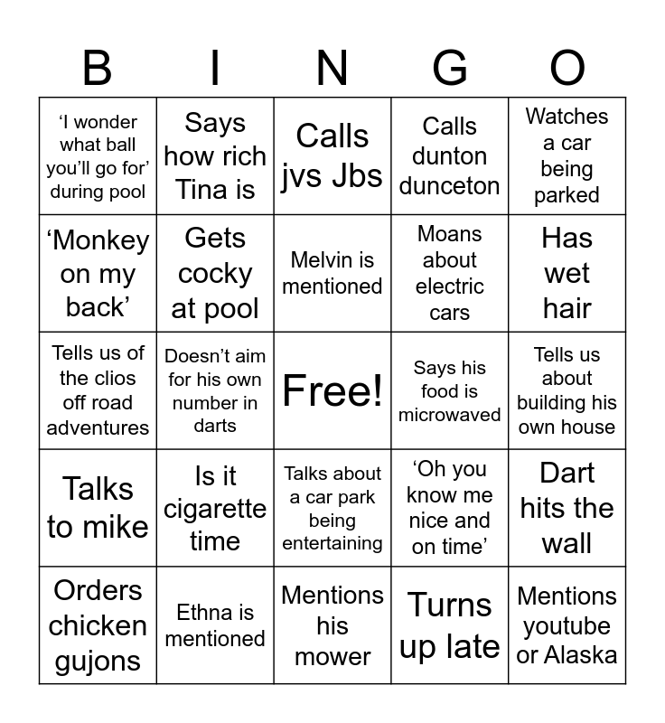 This bingo card has a free space and 24 words: Is it cigarette time, Ethna is mentioned, Melvin is mentioned, Orders chicken gujons, Watches a car being parked, ‘I wonder what ball you’ll go for’ during pool, ‘Monkey on my back’, Says how rich Tina is, Says his food is microwaved, Talks about a car park being entertaining, Moans about electric cars, Tells us of the clios off road adventures, ‘Oh you know me nice and on time’, Dart hits the wall, Gets cocky at pool, Turns up late, Tells us about building his own house, Calls jvs Jbs, Has wet hair, Doesn’t aim for his own number in darts, Mentions youtube or Alaska, Talks to mike, Calls dunton dunceton and Mentions his mower.