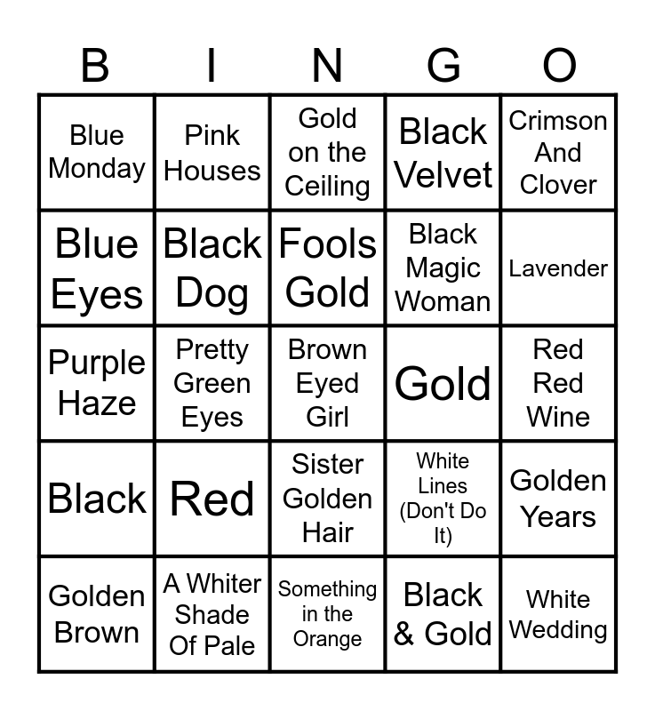This bingo card has 59 words: Fade To Grey, A Whiter Shade Of Pale, Back In Black, Black, Black & Gold, Black Betty, Black Dog, Black Heart, Black Magic Woman, Black Night, Black Velvet, Blue Boy, Blue Eyes, Blue Hotel, Blue Letter, Blue Monday, Brown Eyed Girl, Crimson And Clover, Electric Blue, Fools Gold, Gold, Gold on the Ceiling, Golden Brown, Golden Years, Green Door, Green Green Grass Of Home, Green Light, Green Onions, Lavender, Misty Blue, Nights In White Satin, Orange Crush, Paint It, Black, Pink Cadillac, Pink Houses, Pink Sunshine, Pretty Fly (For A White Guy), Pretty Green Eyes, Pretty in Pink, Purple Haze, Purple Rain, Red, Red Red Wine, Red Skies, Roses Of Red, Science Is Golden, Silver Lady, Silver Machine, Sister Golden Hair, Something in the Orange, Suite Judy Blue Eyes, Supermassive Black Hole, The Lady In Red, Welcome to the Black Parade, White Flag, White Lines (Don't Do It), White Room, White Wedding and Yellow.
