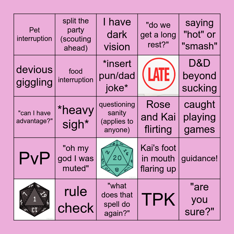 This bingo card has 3 images, a free space and 26 words: "what was happening?", *heavy sigh*, "what's my modifier?", Pet interruption, I have dark vision, food interruption, "oh my god I was muted", Rose and Kai flirting, rule check, caught playing games, "are you sure?", "what does that spell do again?", TPK, D&D beyond sucking, dice dropping, PvP, saying "hot" or "smash", "can I have advantage?", Kai's foot in mouth flaring up, parent interruption, devious giggling, "do we get a long rest?", split the party (scouting ahead), guidance!, *insert pun/dad joke* and unable to find the simple solution.