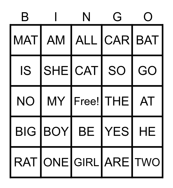 This bingo card has a free space and 25 words: BOY, GIRL, CAT, RAT, BAT, MAT, IS, AM, THE, BE, SO, NO, YES, HE, SHE, EAT, AT, ALL, GO, MY, TWO, ONE, BIG, CAR and ARE.