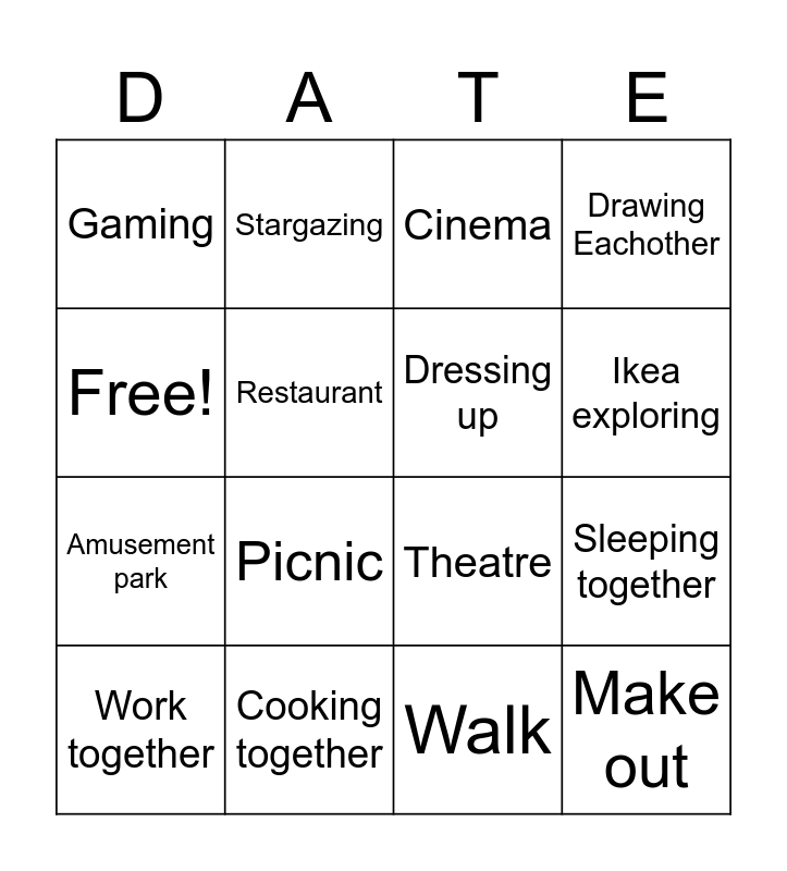 This bingo card has 16 words: Cooking together, Sleeping together, Cinema, Gaming, Amusement park, Stargazing, Theatre, Walk, Free!, Restaurant, Work together, Drawing Eachother, Picnic, Ikea exploring, Dressing up and Make out.