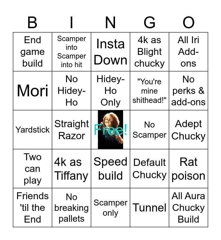 This bingo card has a free space and 24 words: 4k as Tiffany, No breaking pallets, Hidey-Ho Only, Friends 'til the End, All Iri Add-ons, End game build, Mori, Scamper into Scamper into hit, No Scamper, Speed build, "You're mine shithead!", Yardstick, Default Chucky, Rat poison, No Hidey-Ho, Tunnel, Adept Chucky, Insta Down, No perks & add-ons, Straight Razor, All Aura Chucky Build, Two can play, 4k as Blight chucky and Scamper only.