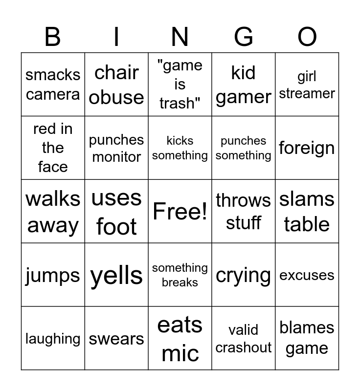 This bingo card has a free space and 24 words: yells, swears, kicks something, laughing, girl streamer, smacks camera, red in the face, chair obuse, throws stuff, something breaks, punches something, walks away, crying, excuses, punches monitor, valid crashout, slams table, "game is trash", foreign, uses foot, blames game, jumps, kid gamer and eats mic.