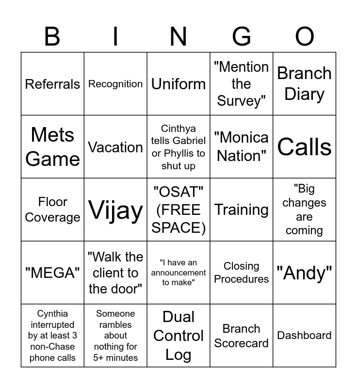 This bingo card has a free space and 24 words: "Walk the client to the door", Someone rambles about nothing for 5+ minutes, Cinthya tells Gabriel or Phyllis to shut up, Cynthia interrupted by at least 3 non-Chase phone calls, Branch Diary, Referrals, Mets Game, Recognition, Training, "I have an announcement to make", "Monica Nation", Floor Coverage, Closing Procedures, "Andy", Vacation, Branch Scorecard, "Big changes are coming, Uniform, Calls, Vijay, Dashboard, "MEGA", "Mention the Survey" and Dual Control Log.