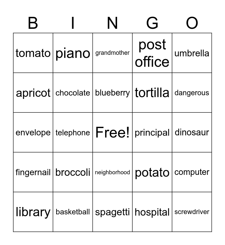 This bingo card has a free space and 24 words: broccoli, basketball, blueberry, library, umbrella, tomato, apricot, piano, principal, neighborhood, tortilla, envelope, potato, computer, chocolate, hospital, dinosaur, grandmother, dangerous, telephone, screwdriver, fingernail, post office and spagetti.