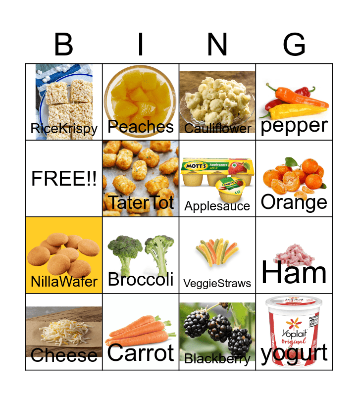 This bingo card has 15 images and 16 words: Carrot, Ham, Cauliflower, RiceKrispy, NillaWafer, Peaches, VeggieStraws, Blackberry, FREE!!, TaterTot, Cheese, pepper, Broccoli, Orange, Applesauce and yogurt.