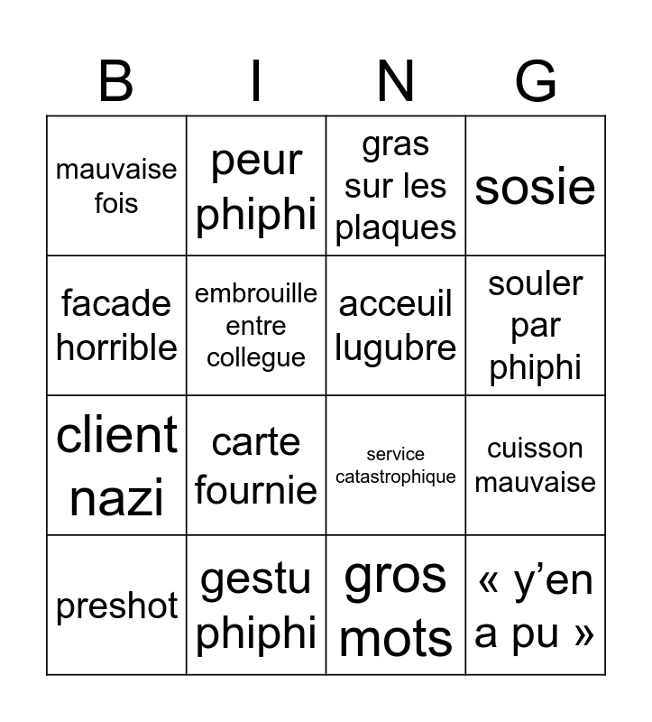 This bingo card has 16 words: gestu phiphi, cuisson mauvaise, gras sur les plaques, mauvaise fois, client nazi, peur phiphi, service catastrophique, gros mots, facade horrible, embrouille entre collegue, preshot, sosie, carte fournie, souler par phiphi, acceuil lugubre and « y’en a pu ».