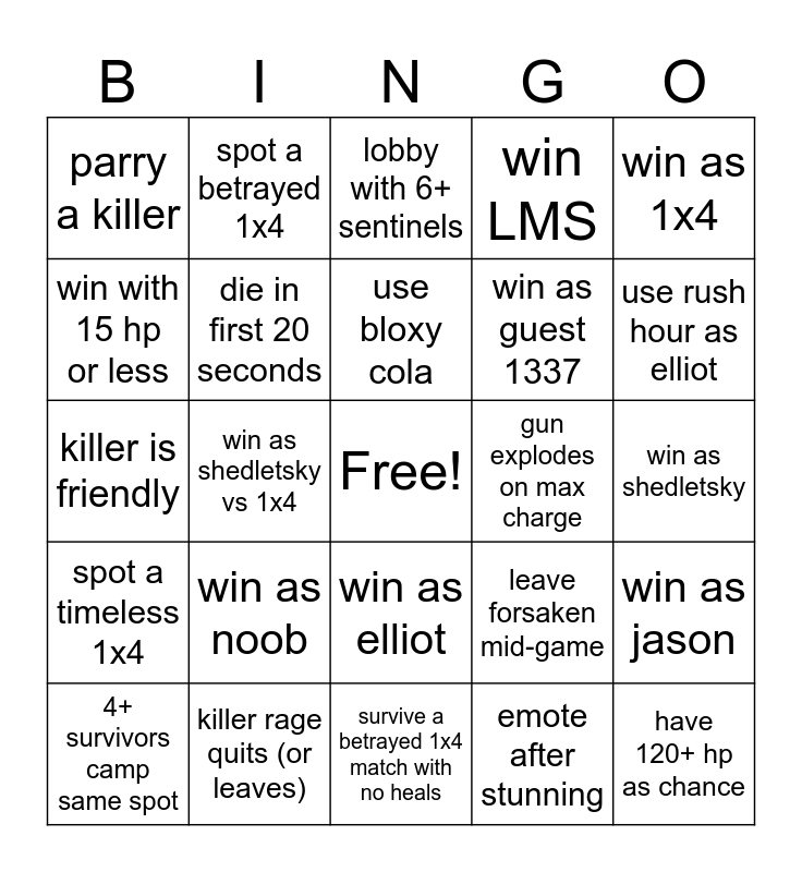This bingo card has a free space and 24 words: win as noob, killer rage quits (or leaves), use bloxy cola, 4+ survivors camp same spot, win as 1x4, parry a killer, win with 15 hp or less, spot a betrayed 1x4, gun explodes on max charge, win as elliot, win as guest 1337, killer is friendly, leave forsaken mid-game, win as jason, die in first 20 seconds, emote after stunning, win as shedletsky, lobby with 6+ sentinels, use rush hour as elliot, win as shedletsky vs 1x4, have 120+ hp as chance, spot a timeless 1x4, win LMS and survive a betrayed 1x4 match with no heals.