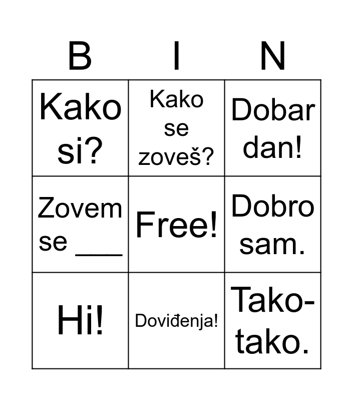 This bingo card has a free space and 9 words: Hi!, Dobar dan!, Kako se zoveš?, Zovem se ___, Kako si?, Dobro sam., Tako-tako., Drago mi je! and Doviđenja!.