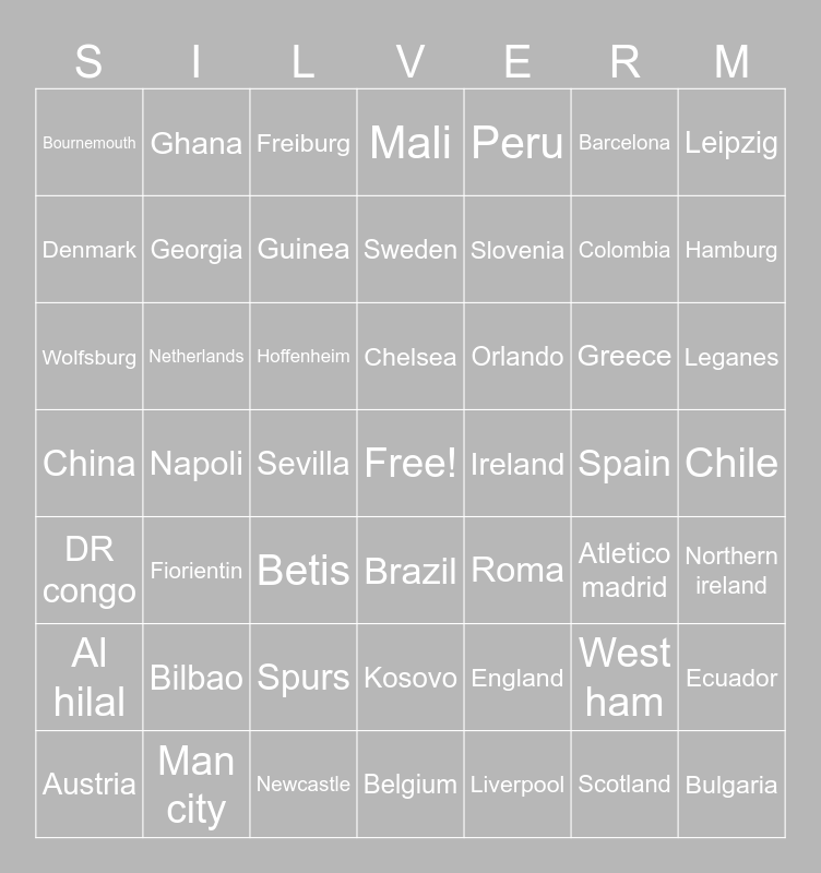 This bingo card has a free space and 132 words: Argentina, Brazil, England, France, Germany, Italy, Netherlands, Portugal, Spain, Belgium, Albania, Algeria, Austria, Australia, Angola, Bosnia, Bulgaria, Burkina faso, Cameroon, Canada, Chile, China, Colombia, Croatia, Czechia, DR congo, Denmark, Ecuador, Egypt, Finland, Georgia, Ghana, Greece, Guinea, Hungary, Iceland, Ivory coast, Japan, Jamaica, Korea, Mali, Mexico, Morocco, Nigeria, New zealand, Northern ireland, Norway, Kosovo, Paraguay, Peru, Poland, Ireland, Romania, Russia, Arabia, Scotland, Senegal, Serbia, Slovakia, Slovenia, Sweden, Switzerland, Turkey, Usa, Ukraine, Uruguay, Venezuela, Wales, Zambia, Barcelona, Real madrid, Chelsea, Psg, Bayern, Arsenal, Ol, Man city, Liverpool, Atletico madrid, Man utd, Spurs, Leverkusen, Juventus, Wolfsburg, Roma, Villa, Inter, Frankfurt, Bilbao, Dortmund, Leipzig, Milan, Brighton, Napoli, Sociedad, Benfica, Newcastle, Betis, Forrest, Lille, Freiburg, Orlando, Hoffenheim, Atalanta, Ajax, Leicester, Fiorientin, West ham, Lazio, Monaco, Bremen, Sevilla, Villareal, Sporting, Porto, Fenerbache, Galatasary, Crystal palace, Girona, Marseillea, Al hilal, Psv, Valencia, Bournemouth, Brentford, Hamburg, Leganes, kortrijk, Anderlecht, Southampton, Ipswich and Leeds.