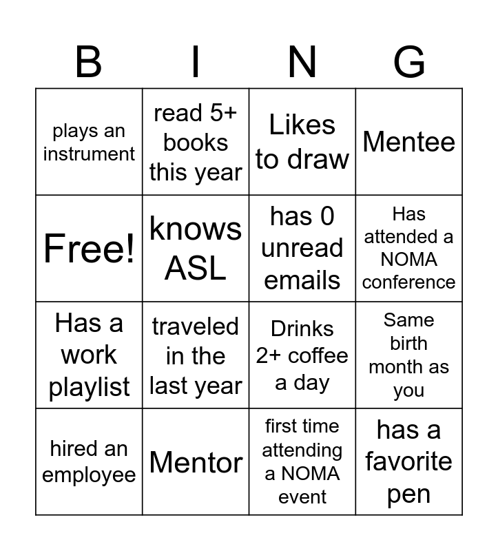 This bingo card has 16 words: Mentor, Same birth month as you, Likes to draw, plays an instrument, Has a work playlist, read 5+ books this year, Drinks 2+ coffee a day, first time attending a NOMA event, Free!, knows ASL, hired an employee, Mentee, traveled in the last year, Has attended a NOMA conference, has 0 unread emails and has a favorite pen.