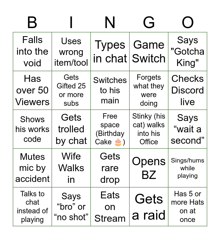 This bingo card has a free space and 24 words: Wife Walks in, Says “bro” or “no shot”, Switches to his main, Talks to chat instead of playing, Says "Gotcha King", Falls into the void, Has over 50 Viewers, Uses wrong item/tool, Stinky (his cat) walks into his Office, Gets rare drop, Forgets what they were doing, Shows his works code, Opens BZ, Sings/hums while playing, Gets Gifted 25 or more subs, Gets a raid, Says “wait a second”, Types in chat, Checks Discord live, Gets trolled by chat, Has 5 or more Hats on at once, Mutes mic by accident, Game Switch and Eats on Stream.