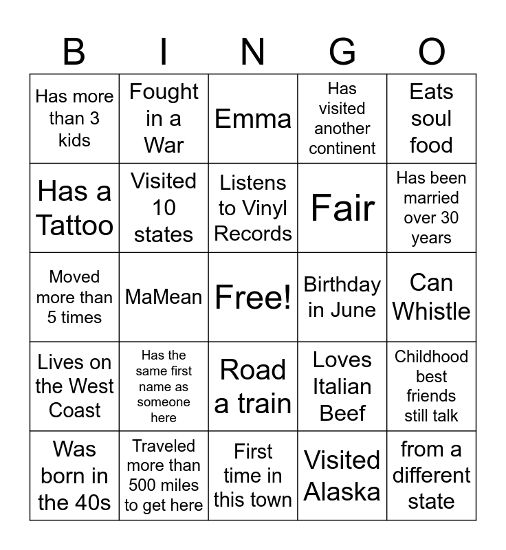 This bingo card has a free space and 24 words: Has the same first name as someone here, Traveled more than 500 miles to get here, Listens to Vinyl Records, Was born in the 40s, Eats soul food, Has more than 3 kids, Has a Tattoo, Fought in a War, Birthday in June, Road a train, Fair, Moved more than 5 times, Loves Italian Beef, Childhood best friends still talk, Visited 10 states, Visited Alaska, Can Whistle, Emma, Has been married over 30 years, MaMean, from a different state, Lives on the West Coast, Has visited another continent and First time in this town.