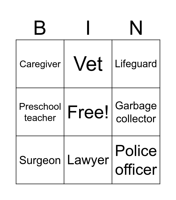 This bingo card has a free space and 12 words: Firefighter, Nurse, Police officer, Garbage collector, Vet, Lifeguard, Lawyer, Paramedic, Caregiver, Preschool teacher, Surgeon and Volunteer.