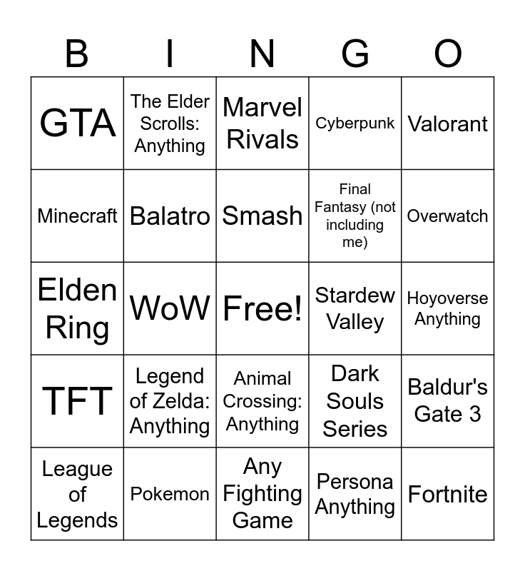 This bingo card has a free space and 24 words: Legend of Zelda: Anything, Pokemon, Smash, League of Legends, Valorant, GTA, Minecraft, The Elder Scrolls: Anything, Stardew Valley, Animal Crossing: Anything, Final Fantasy (not including me), Elden Ring, Dark Souls Series, Baldur's Gate 3, Balatro, Persona Anything, Hoyoverse Anything, Marvel Rivals, Overwatch, WoW, Fortnite, TFT, Cyberpunk and Any Fighting Game.